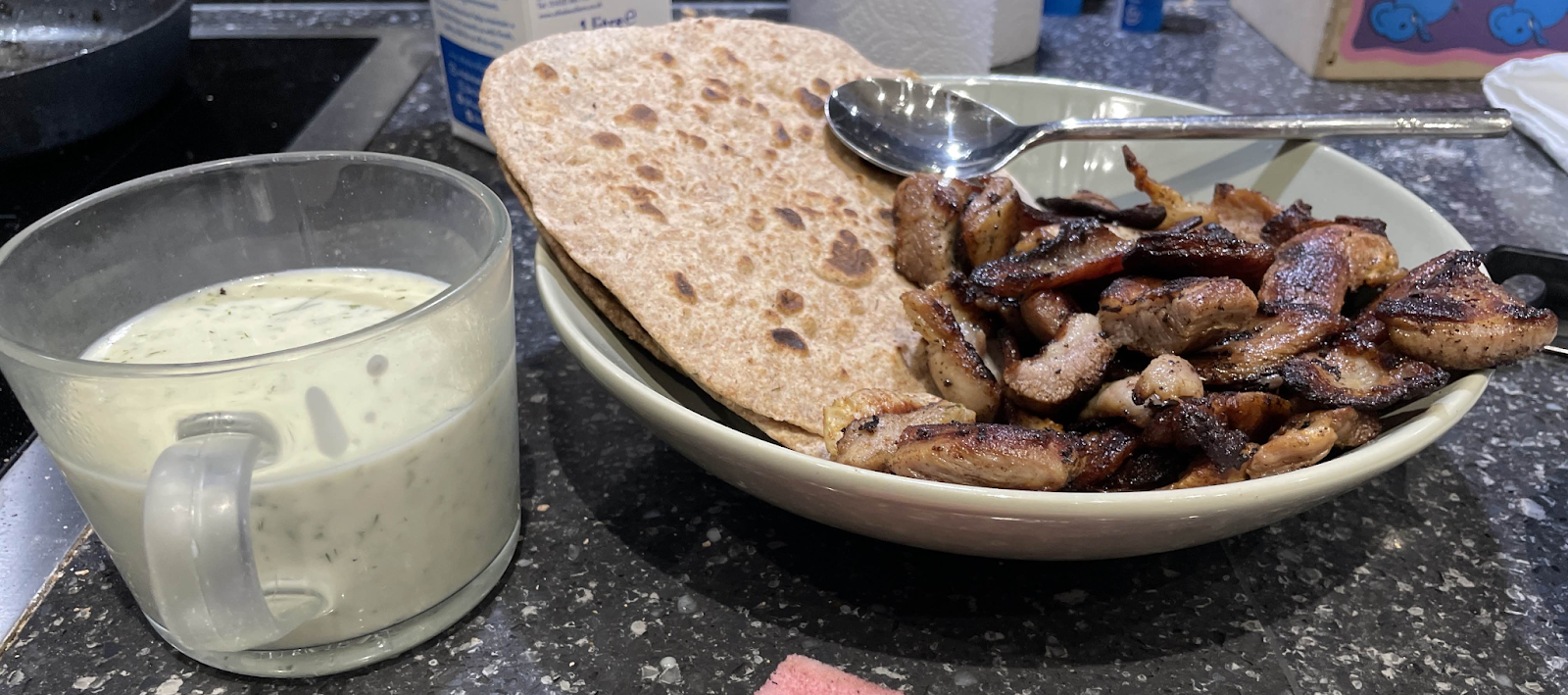 A meal from whiterun, cured lamb served with a wheat flatbread and a sauce of garlic and goat cheese.