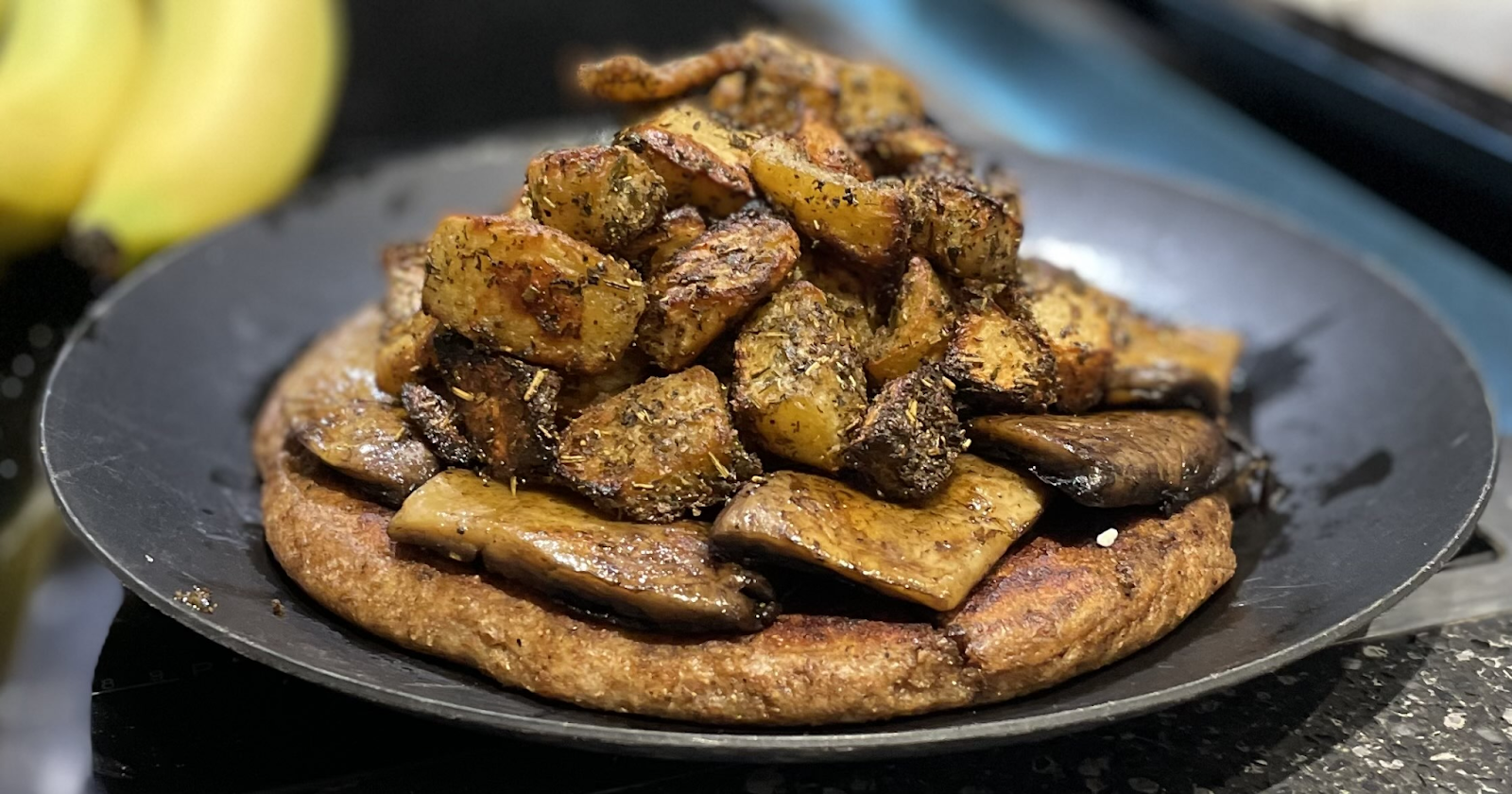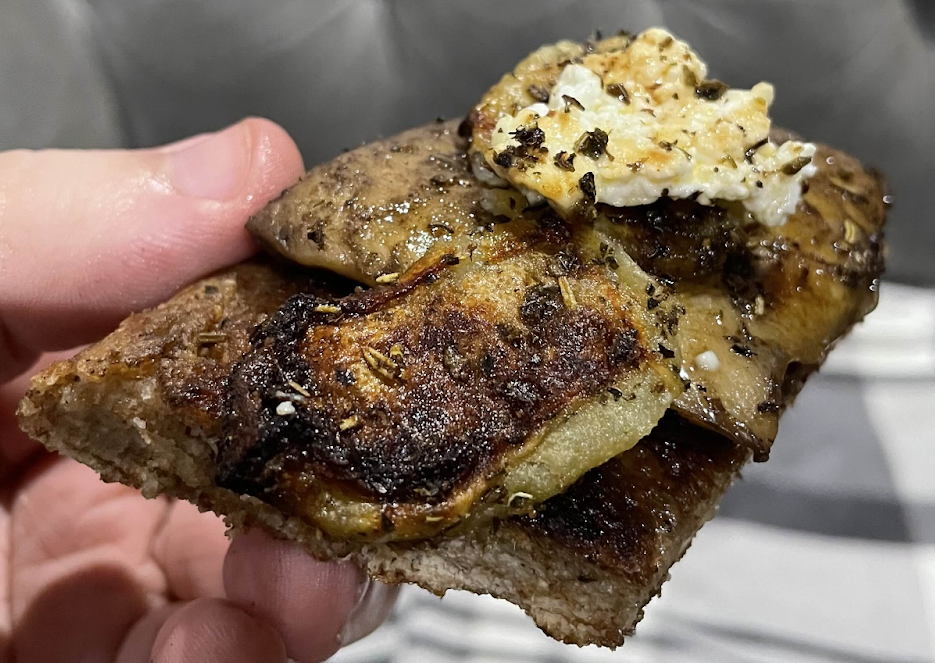 The flatbread is made from a wheat-based dough, cooked in an iron skillet. Flat mushrooms are then cooked in the same skillet, and the flatbread is placed atop them as they are cooked to absorb released moisture. Pumpkins are roasted in lard, coated in herbs, and then placed atop the flatbread. There is an accompaniment of coagulated cheese curds.